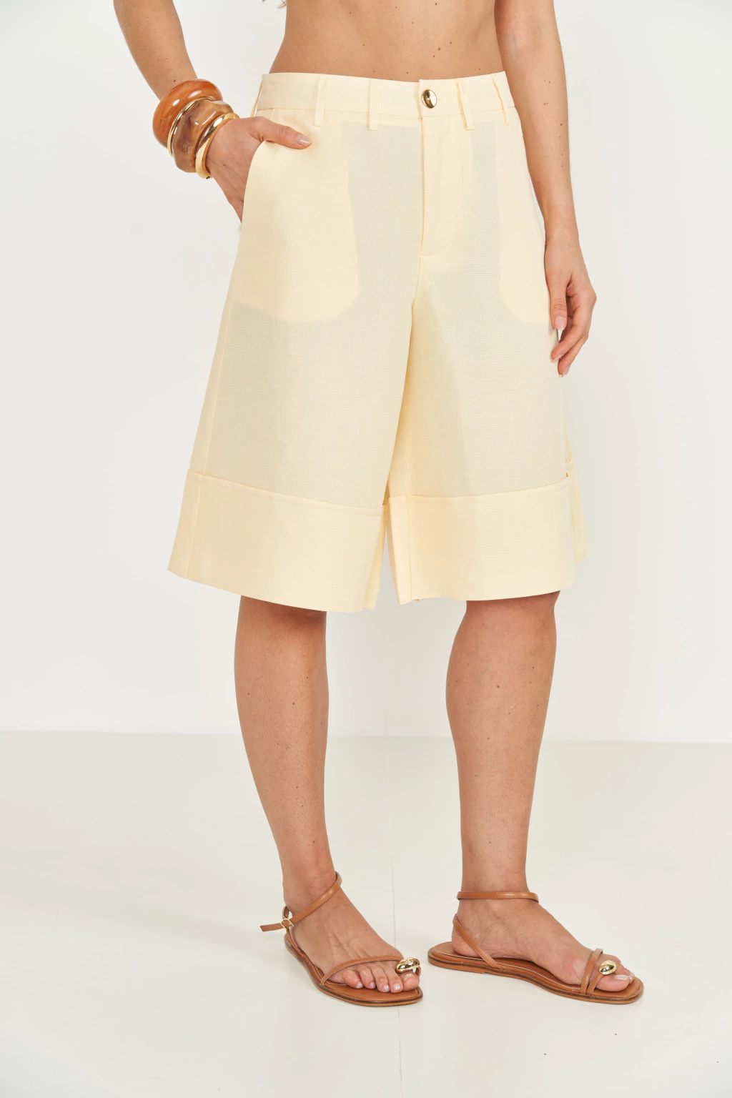 Imersa na leveza e nos tons suaves da Costa Amalfitana, a Bermuda Jade Alfaiataria Média da coleção Colcci Menu – Verão 26 é a peça que captura a essência do verão italiano com um toque de modernidade e elegância despretensiosa. Seu tom amarelo pastel evoca a luminosidade do sol e a brisa do Mediterrâneo, irradiando bem-estar e um estilo inconfundível. Com um design inovador que celebra a fluidez, o movimento e a autenticidade, esta bermuda Colcci é perfeita para expressar uma feminilidade marcante e sofisticada, convidando a viver, sentir e saborear a estação, dos almoços à beira-mar aos passeios relaxantes, com um ar refrescante e inspirador que remete aos melhores momentos da temporada.
