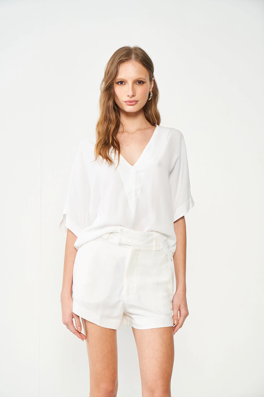 Combinar as Blusas mais curtas com short traz um visual mais descontraído e jovem para quem usa esse look. Ideal para um passeio casual em um dia de verão.