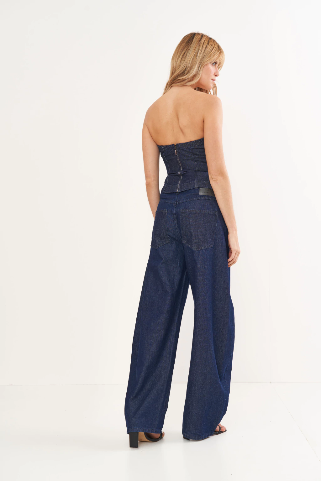 Prepare-se para um look de impacto! Esta blusa jeans tomara que caia é a definição de poder e sofisticação. Com uma estrutura que remete a um corselet, ela desenha a silhueta de forma impecável, enquanto a barra levemente evasê adiciona um toque de feminilidade e movimento. É a peça perfeita para quem ama a tendência 'total jeans' e não tem medo de ousar com elegância.