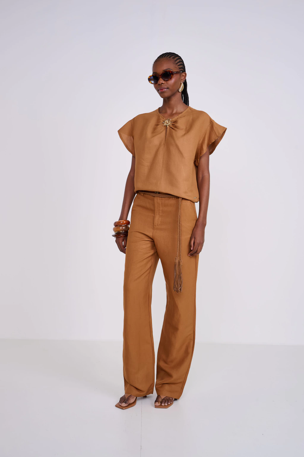 Para um look que exala a sofisticação do verão Colcci, combine esta blusa caramelo com a calça pantalona da mesma tonalidade, como na imagem, para um conjunto monocromático poderoso e elegante. Adicione um cinto trançado para marcar a cintura e sandálias rasteiras delicadas. Acessórios em tons terrosos, como braceletes de madeira e brincos dourados, complementam o visual com um ar artesanal chic. Para um happy hour, experimente com shorts jeans de cintura alta e tênis branco. Esta peça é a base versátil para looks que celebram a feminilidade, o frescor e a autenticidade da estação, perfeita para diversas ocasiões.
