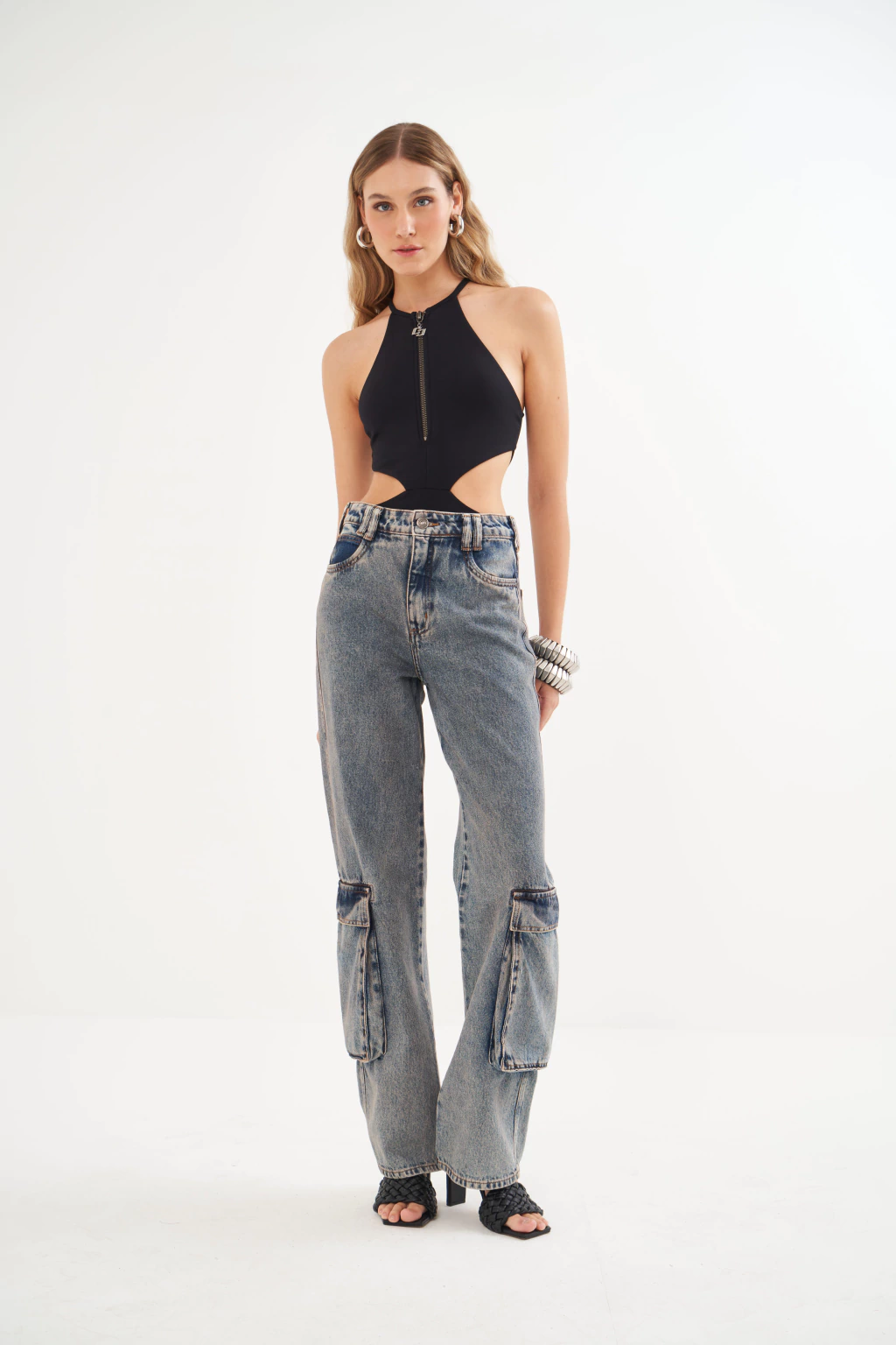 Para um contraste hi-lo super moderno, combine o body com nossa calça jeans cargo de lavagem vintage, como na foto. A união do utilitário com o sensual cria um look autêntico e cheio de atitude. Para uma produção noturna sofisticada, aposte em uma calça de alfaiataria ou uma saia de chiffon fluida para brincar com texturas e movimentos.