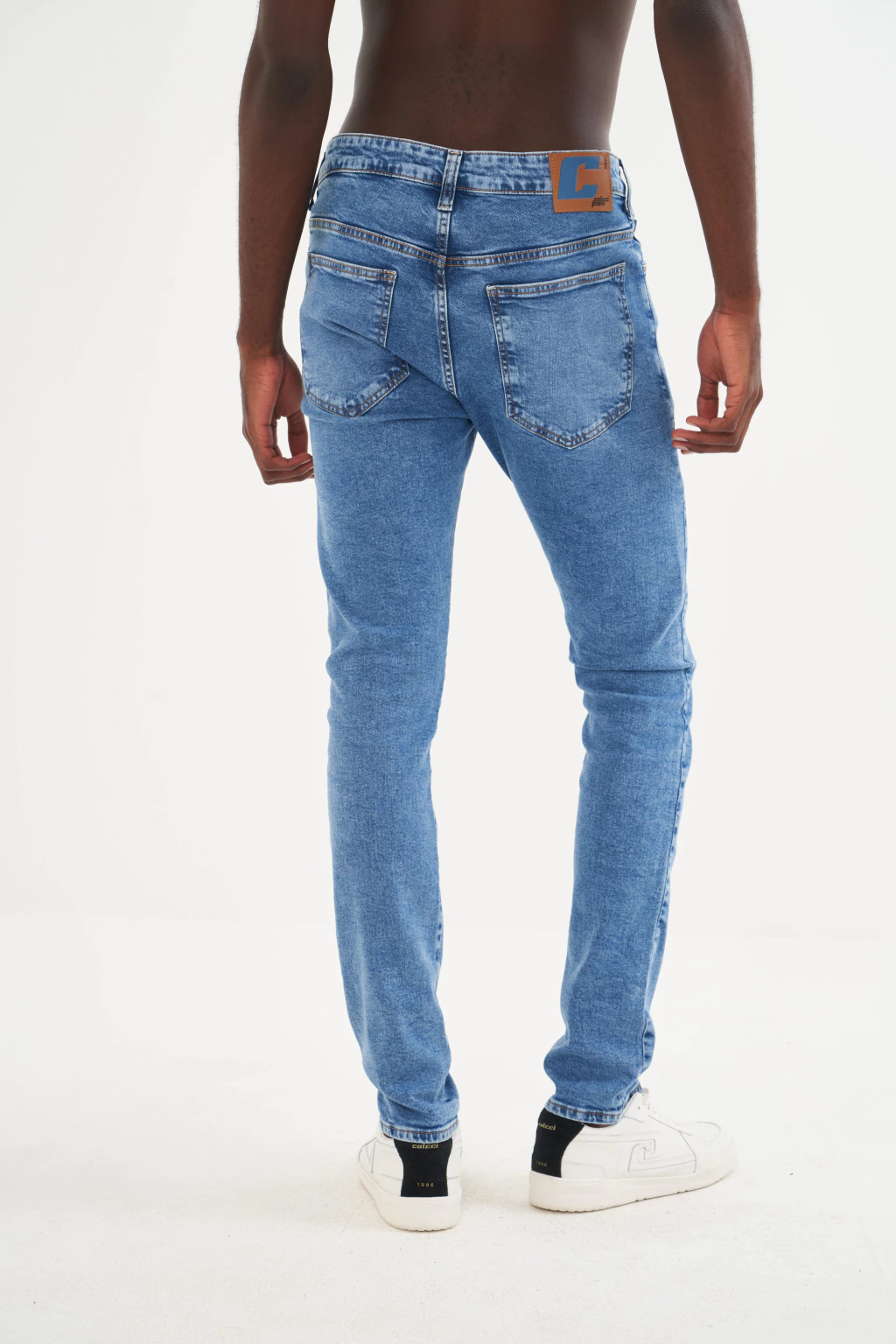 Design: Modelagem Felipe, caracterizada por um corte justo (skinny) que acompanha as curvas do corpo, oferecendo um visual contemporâneo e elegante. A lavagem em jeans azul médio com efeito estonado clássico proporciona um estilo atemporal e versátil, perfeito para a atmosfera leve e solar da Riviera.
