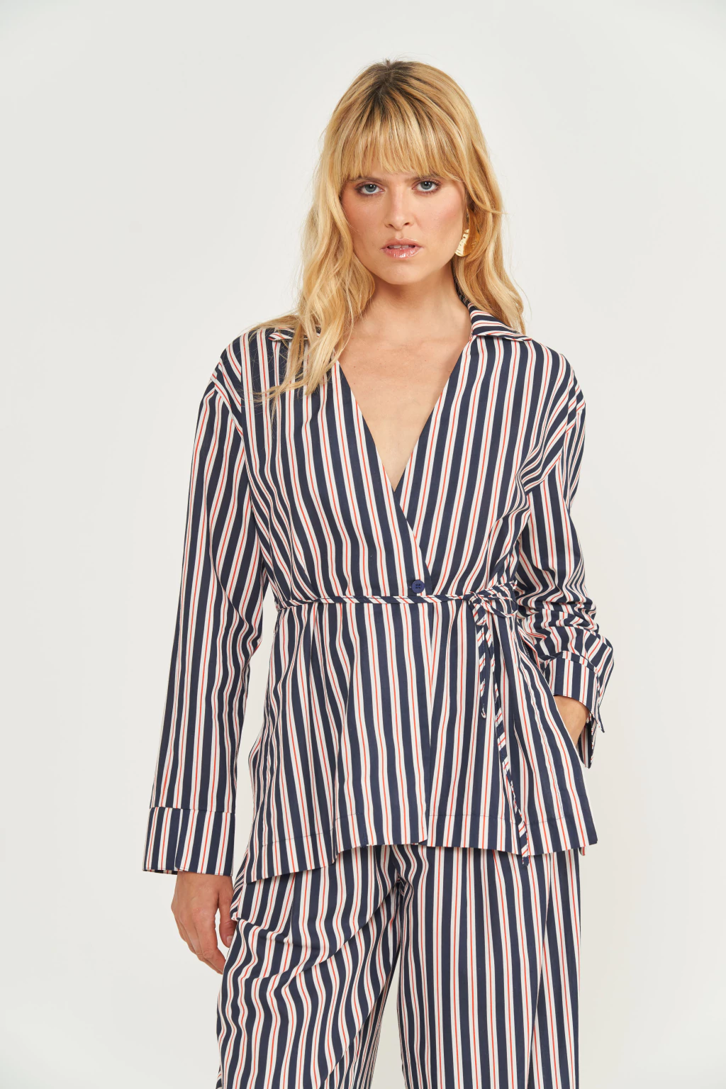 Detalhes: As listras verticais em azul marinho, branco e vermelho conferem um visual clássico e alongador. O fechamento transpassado e a faixa para amarração na cintura criam um visual elegante e adaptável. Bolsos laterais embutidos. Confeccionada em algodão de toque macio e caimento impecável.