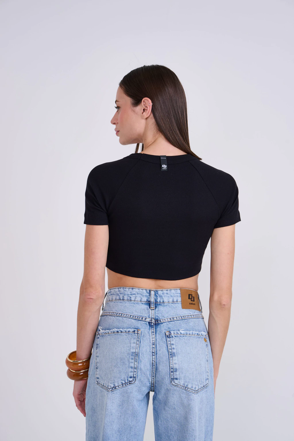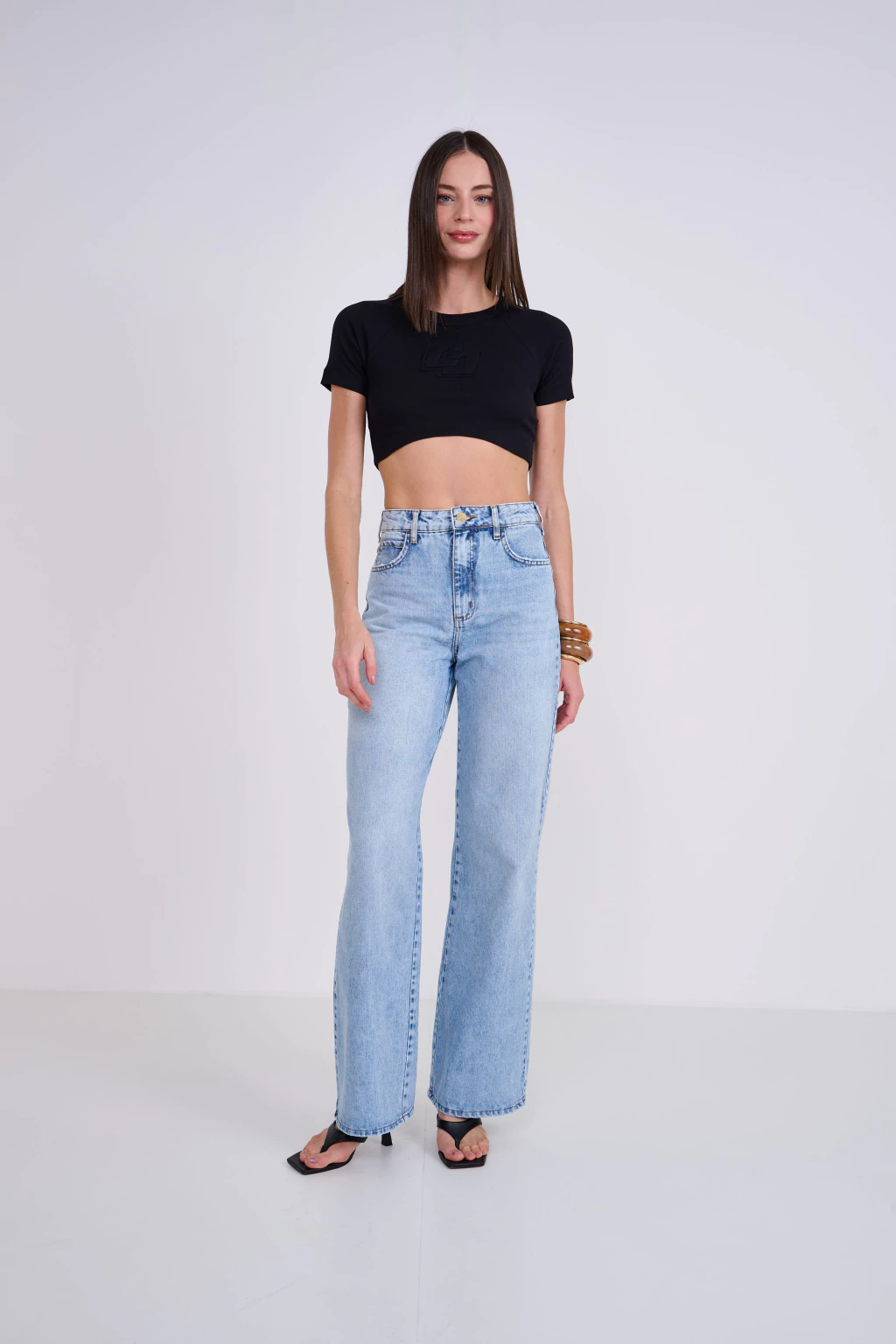 Para um look Colcci SUMMER MENU que celebra a essência da Costa Amalfitana com um toque despojado e sofisticado, combine a Camiseta Slim Canelada em Preto com calças jeans de perna larga e lavagem clara, como na imagem, para um visual casual chic e moderno. Para um toque mais elegante, aposte em saias midi de linho em tons vibrantes ou shorts de alfaiataria claros. Complete com sandálias de tira fina ou mules de salto baixo para um conforto estiloso, e acessórios em madeira ou dourados, como argolas grandes e pulseiras, para realçar a conexão com o sol dourado e a natureza exuberante da paisagem italiana. Esta peça inovadora é um convite para viver os sabores do verão em sua forma mais autêntica e marcante, sentindo e saboreando a estação com o estilo inconfundível da Colcci Verão 26.