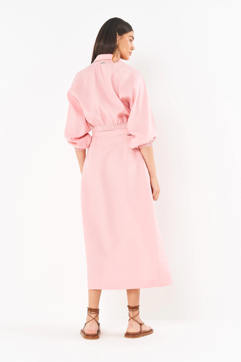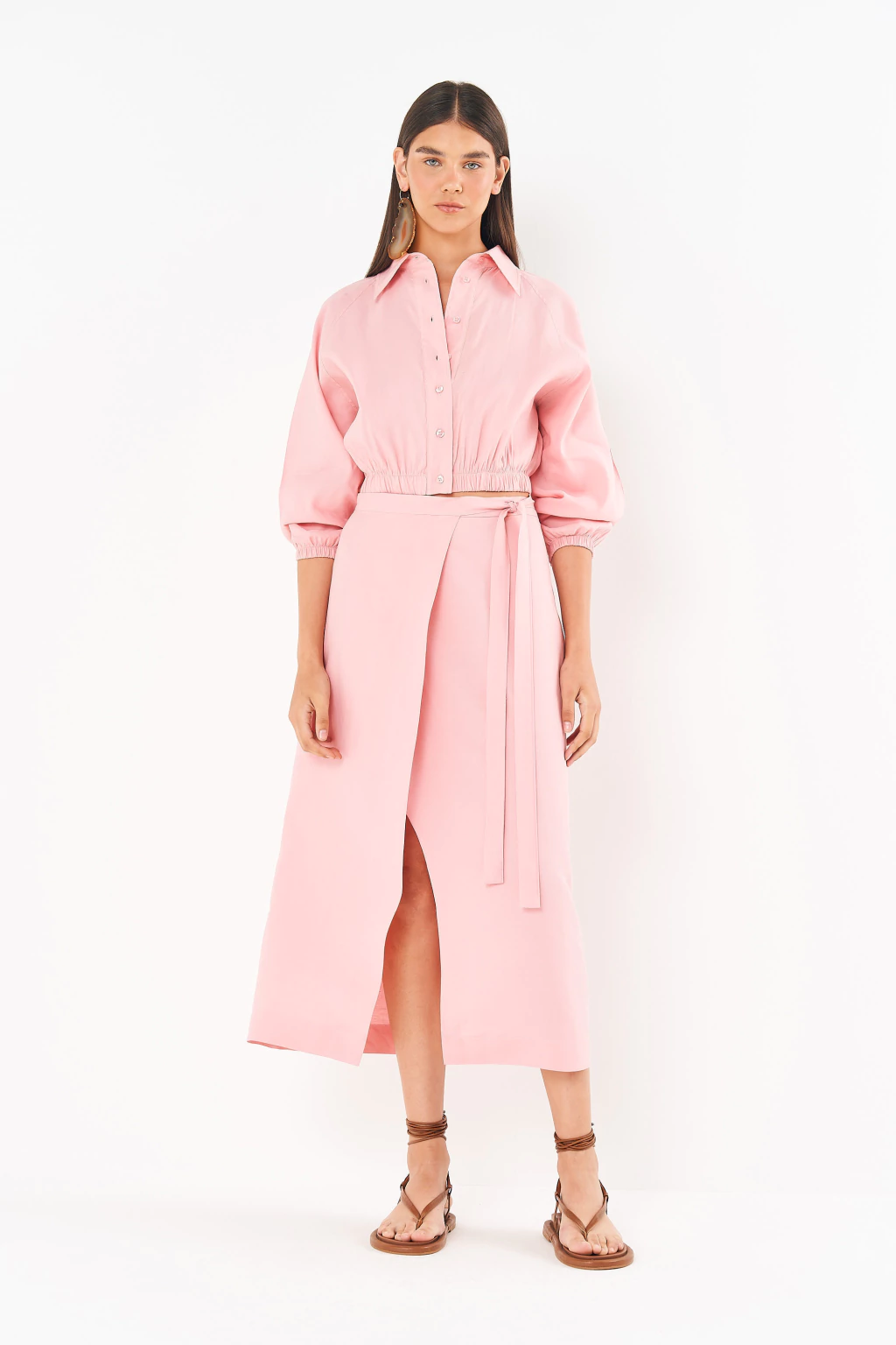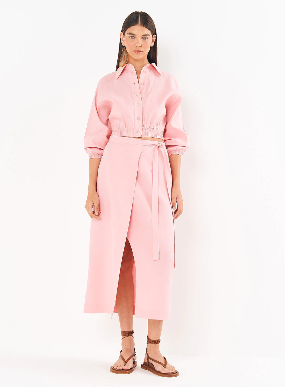 A tradução perfeita do romantismo sofisticado da coleção Riviera. Esta saia midi une a fluidez do design transpassado com a delicadeza do tom rosa pastel, criando uma peça que é pura suavidade e elegância. A silhueta envelope, finalizada com a amarração na cintura, celebra uma feminilidade autêntica e moderna, ideal para viver a leveza dos dias ensolarados com um toque de alfaiataria contemporânea.
