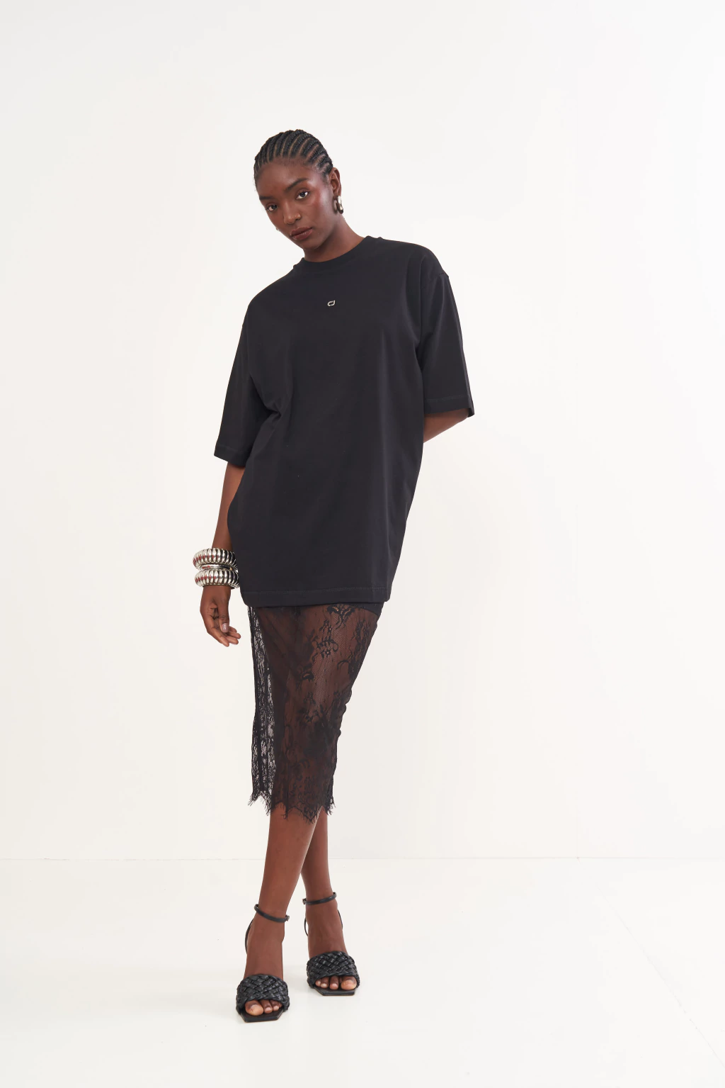 Design: Modelagem lápis com comprimento midi, que desenha a silhueta com elegância. A peça é construída com uma sobreposição de renda floral sobre um forro curto, criando um sofisticado jogo de transparência que revela as pernas. A barra é delicadamente recortada, seguindo o desenho da renda, e possui fechamento por zíper e fenda na parte traseira.