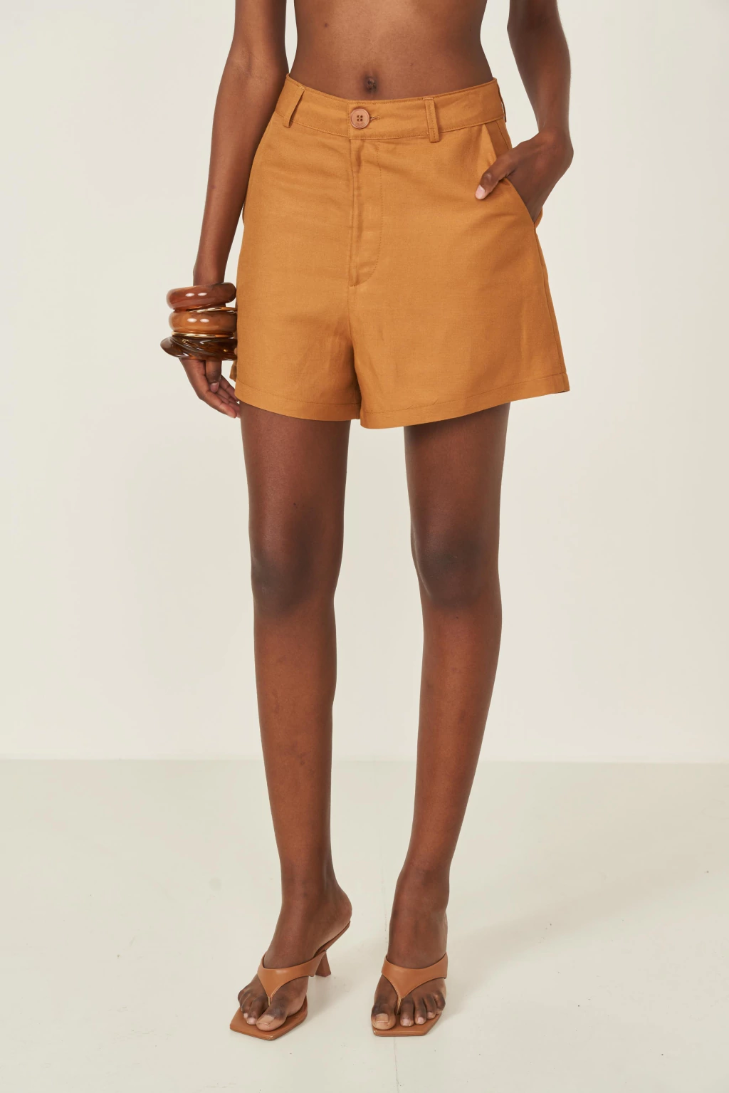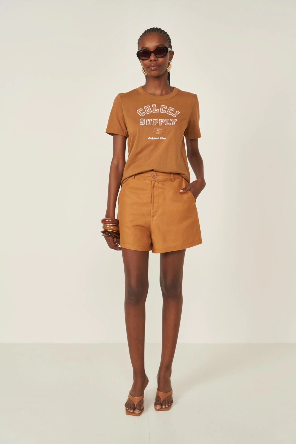 Para um look que exala a leveza e o estilo do verão Colcci, combine este short de alfaiataria com uma camiseta estampada em tons terrosos, como na imagem, para um conjunto monocromático chic e moderno. Adicione sandálias de salto médio em tiras finas para um toque sofisticado, e acessórios em tons naturais, como braceletes de madeira ou brincos dourados, para um toque artesanal. Para um happy hour, experimente com uma blusa de seda e mules. Esta peça é a base versátil para looks que celebram a feminilidade, o frescor e a autenticidade da estação, perfeita para diversas ocasiões, do dia à noite.
