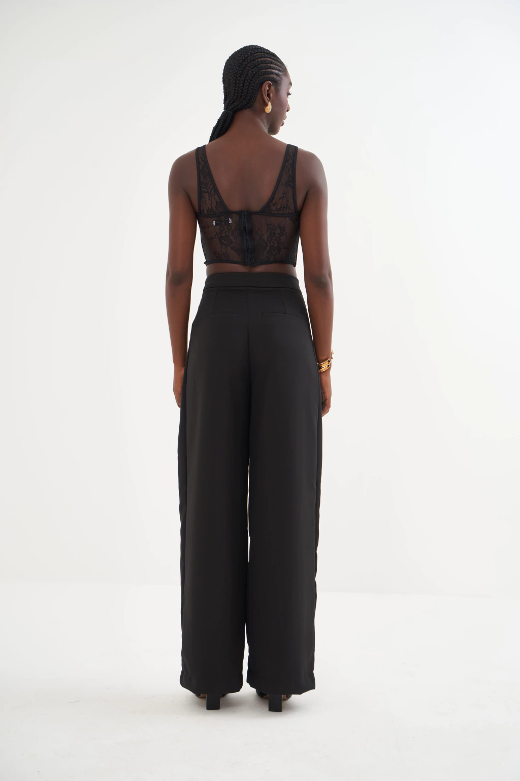 • Para um visual monocromático poderoso, como na imagem, combine com uma calça de alfaiataria preta de cintura alta e pernas amplas. O contraste entre a fluidez da calça e a sensualidade do top é a chave para a sofisticação.