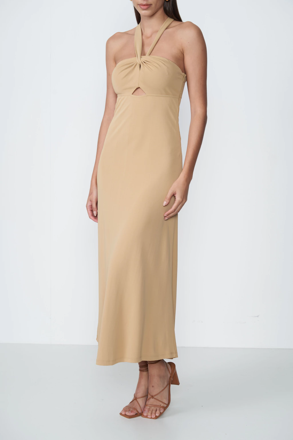 Vestido: Decote em V, alças finas, alça no pescoço, modelagem justa, comprimento midi, caimento fluido.