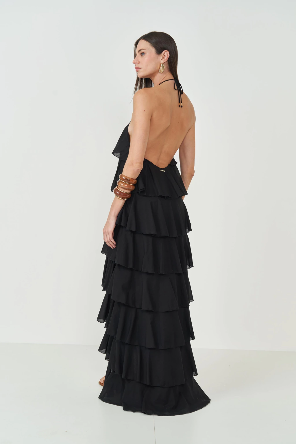 Design: Modelagem longa com corte mullet (mais curto na frente e longo atrás), decote halter (frente única) com amarração no pescoço, costas nuas, e múltiplos babados em camadas na saia.